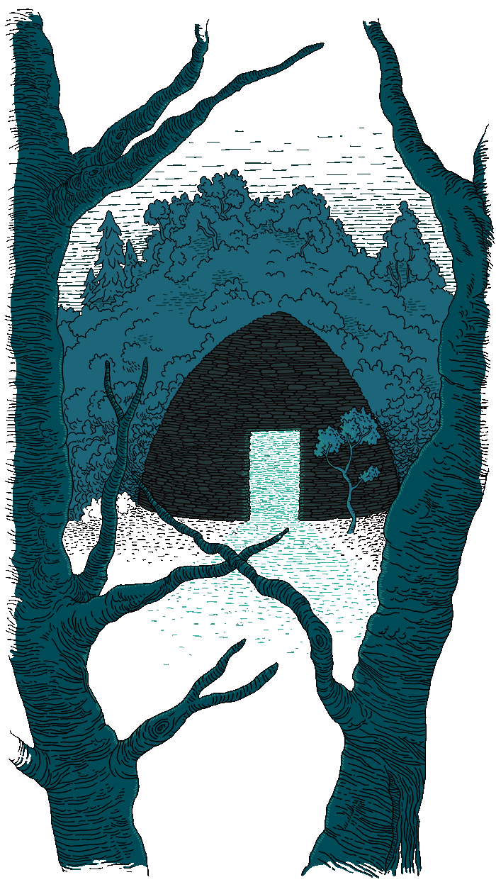 Des ronces et des crevasses. Dix jours durant, je m’étais engagé dans une traque des plus périlleuses, qui virait à l’obsession. Jusqu’à là restée désespérément infructueuse, cette chasse m’avait mené jusqu’aux forêts sacrées du sud, à plus de 5 lieues de la cité. Ce soir là, une pluie battante se déclara, et je me mis en quête d’un abri. C’est alors que j’aperçu la lueur d'un feu. Dans l’ombre, elle dessinait les pourtours d’une hutte de pierre au milieu des bois.